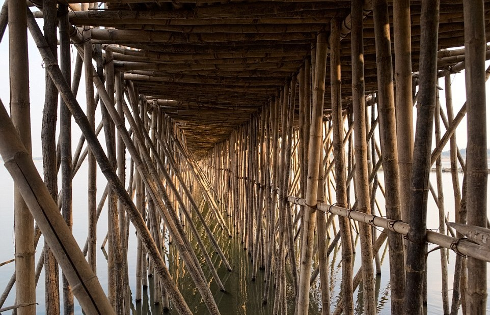 Những cây tre cao được chôn xuống lòng sông cùng với lớp thảm đan bằng tre để tạo nền móng. Nhiều cọc tre được đóng xiên theo các hướng khác nhau quanh móng.