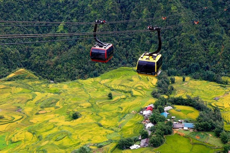 Sapa một bên là những dãy núi non trùng điệp bao quanh, một bên là các bản làng, hay những thửa ruộng bậc thang, khi vào thu những thửa ruộng bậc thang lại khoác lên mình tấm áo choàng mới thiết tha như mời gọi du khách đến thăm.