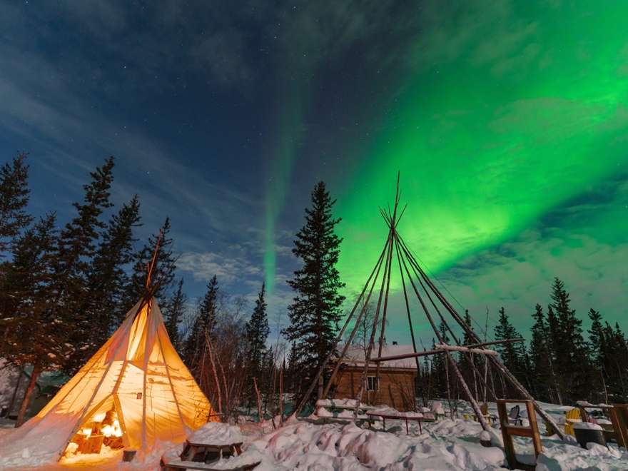 Nhận chiếc lều teepee ấm áp, Quý khách sẽ được lặng ngắm màn cực quang huyền ảo nhảy múa trên bầu trời đêm Canada. Ánh sáng xanh lục, tím, đỏ rực rỡ uốn lượn như dải lụa mềm mại. Cùng tiếng gió nhẹ bên ngoài, cảm giác nhỏ bé giữa vũ trụ bao la, choáng ngợp trước vẻ đẹp phi thường của tự nhiên.